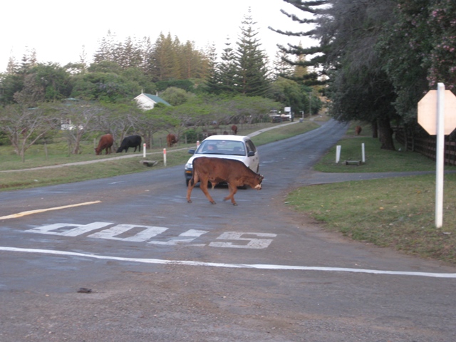 Norfolk is zeer klein, maar 8 bij 5 km, er zijn geen verkeerslichten en 1 rotonde. Je mag niet harder rijden dan 50km en er lopen over het hele eiland koeien die voorrang hebben. Straatverlichting is er ook niet, dus het is er s avonds pikkedonker, als je niet uitkijkt kun je makkelijk ‘s avonds tussen de koeien belanden, zoals ons is gebeurd……